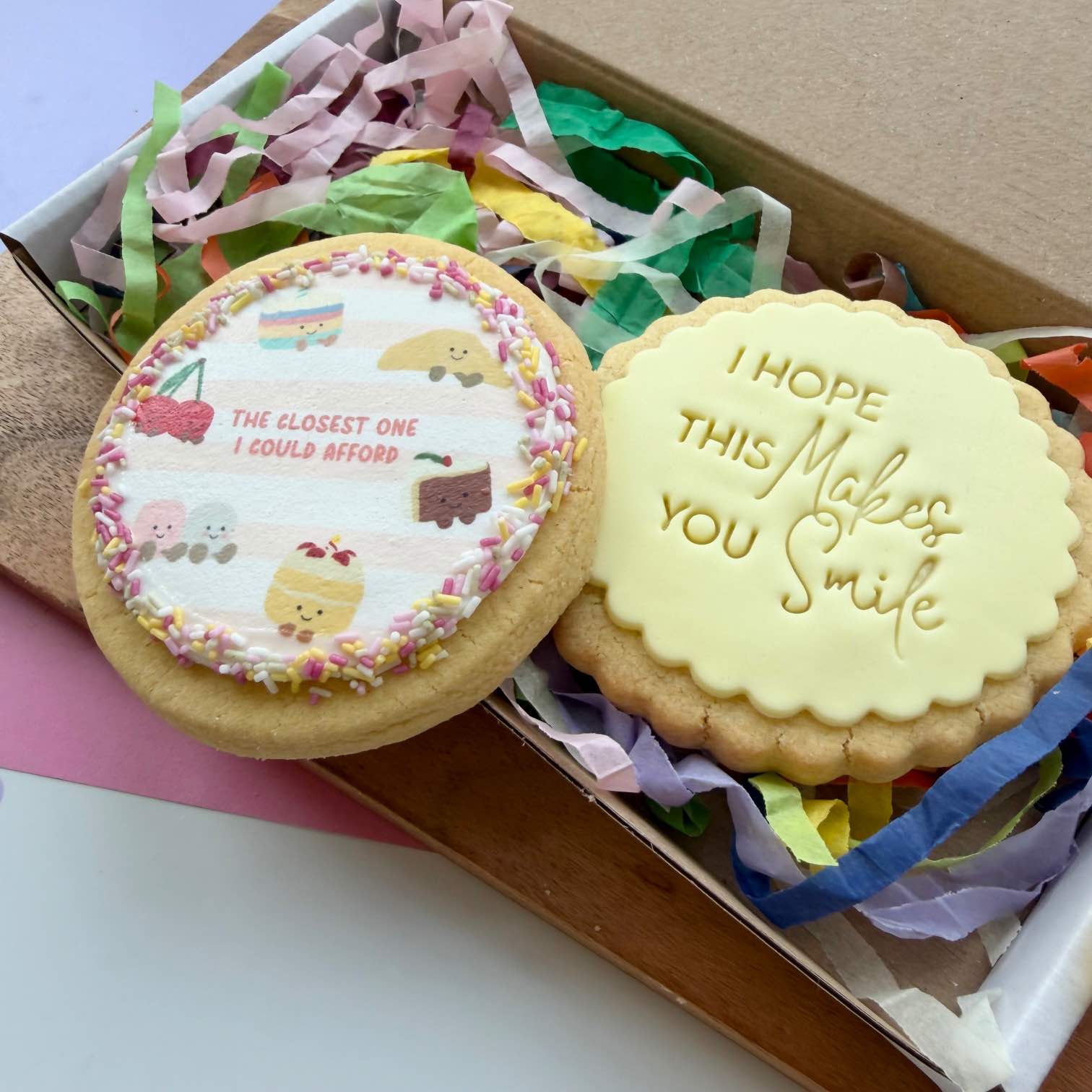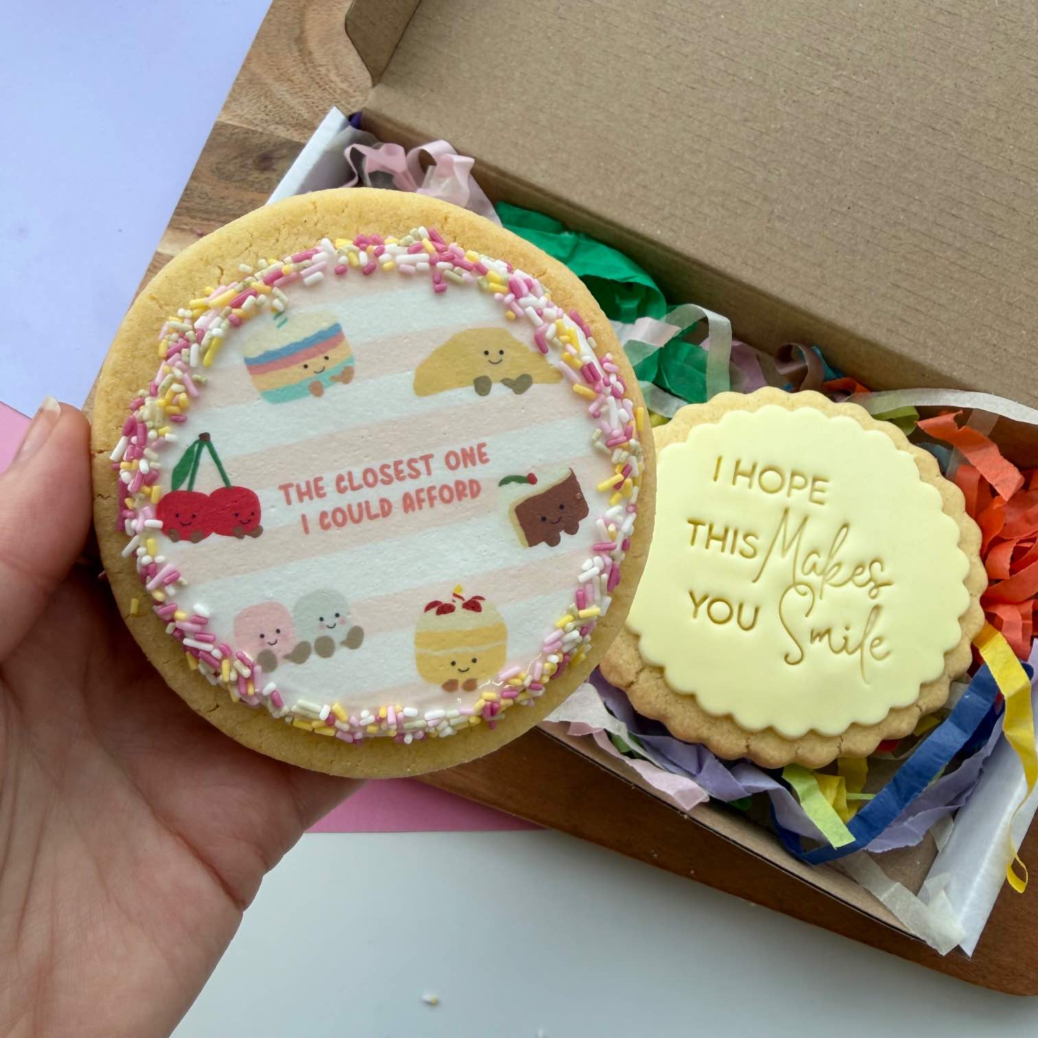 These cookie gift boxes come with the 2 cookies shown and are wrapped in clear compostable bags inside with rainbow tissue. These fit through most large letterboxes.