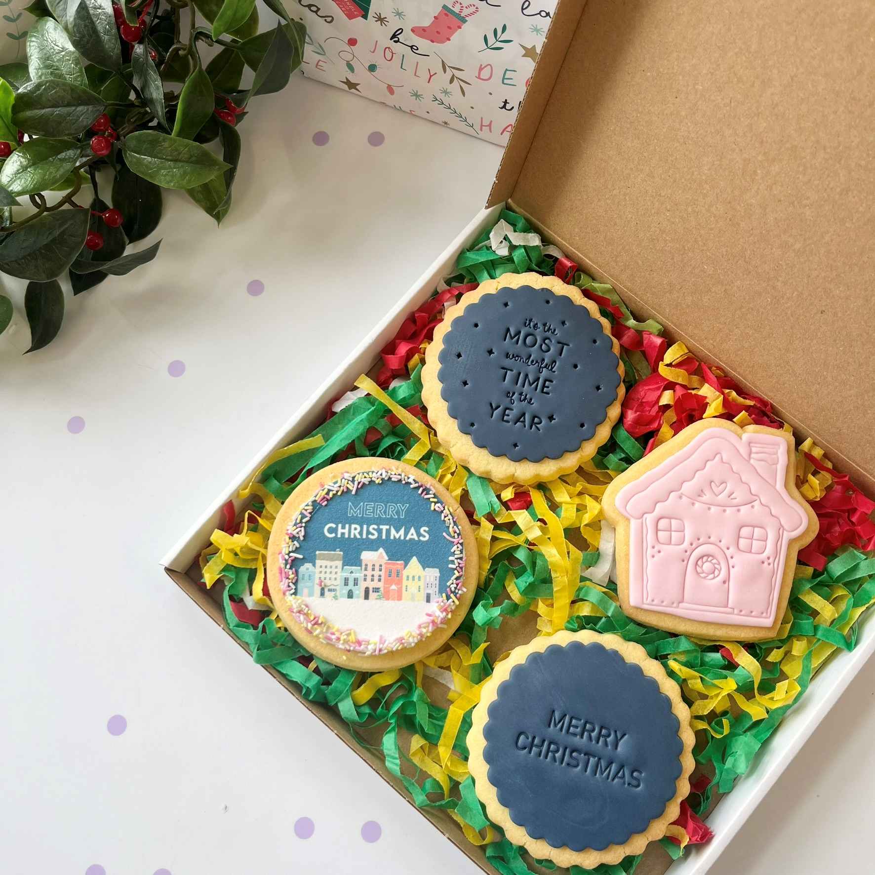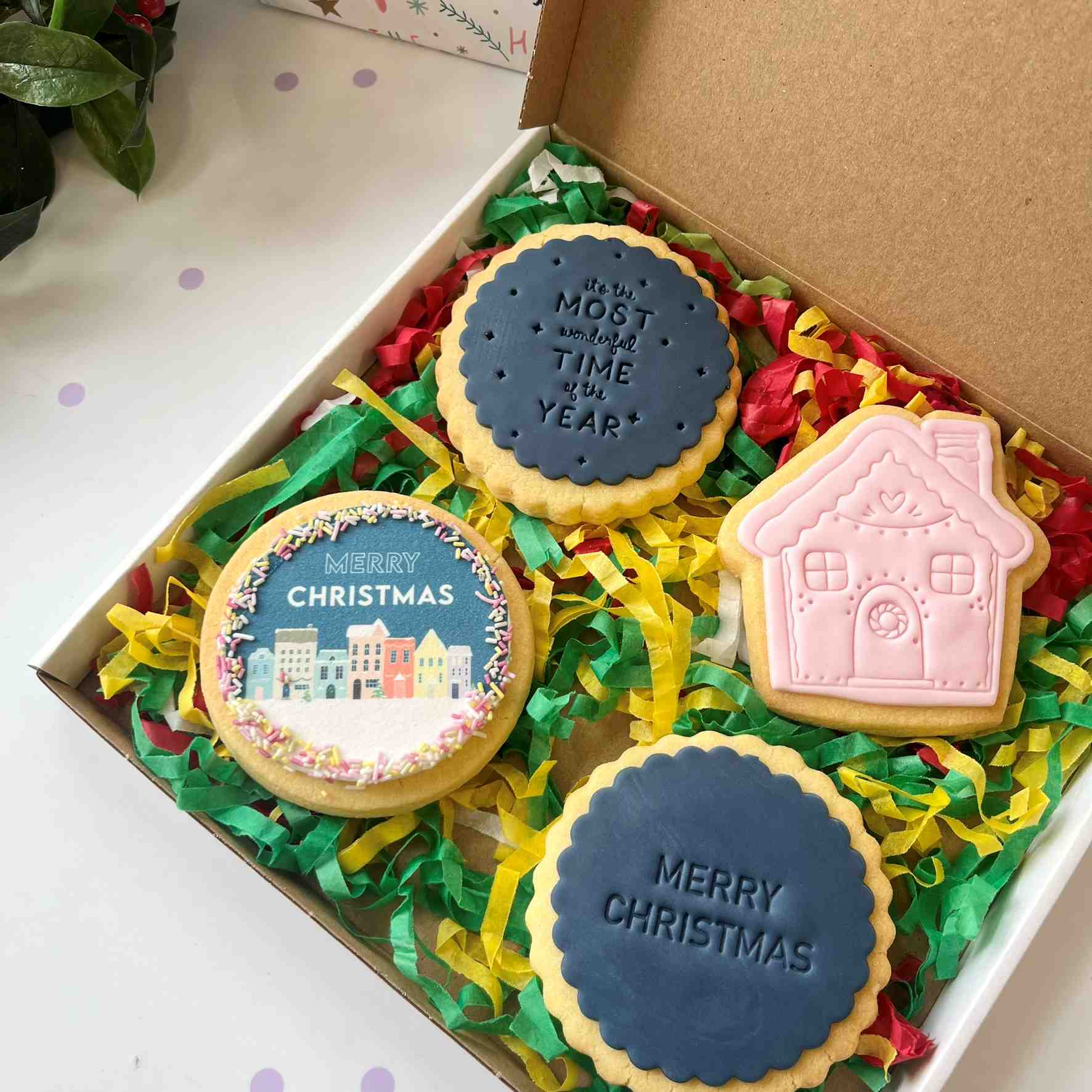 These cookie gift boxes come with the 4 cookies shown and are wrapped in clear compostable bags inside with festive tissue. These fit through most large letterboxes.