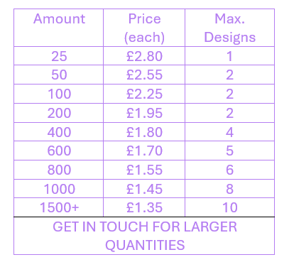 Approx price guide based on 1 delivery location, with a stamped quote design from our range.