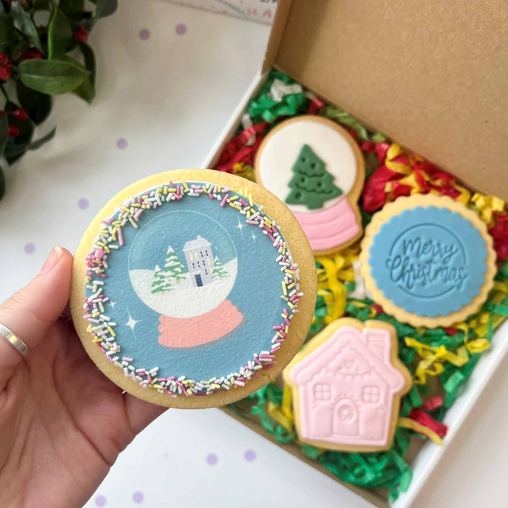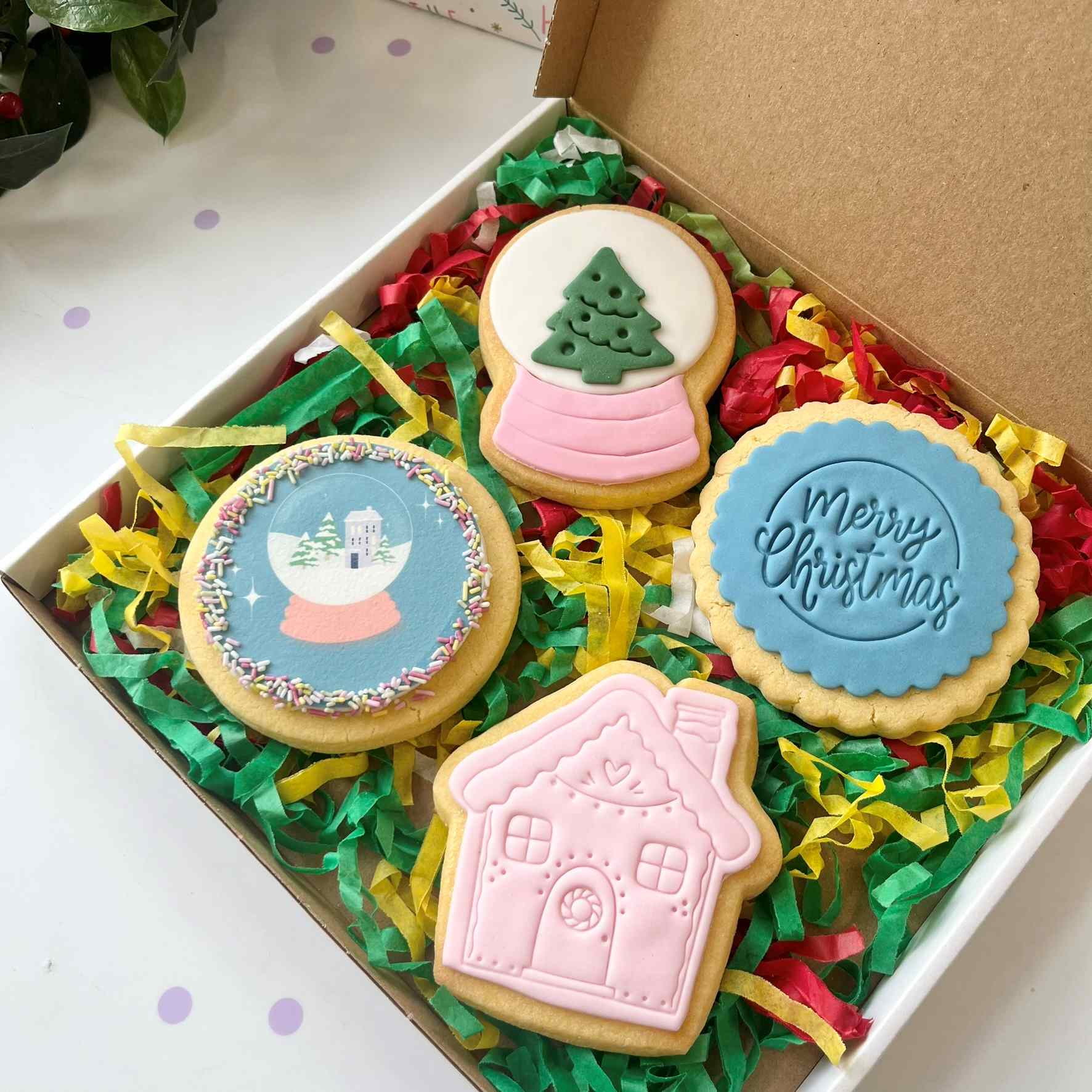 These cookie gift boxes come with the 4 cookies shown and are wrapped in clear compostable bags inside with festive tissue. These fit through most large letterboxes.